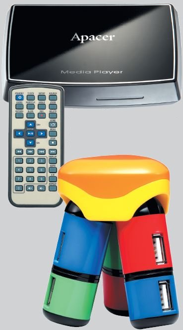Компания Apacer приготовила для участников опроса сразу два цифровых медиаплеера AL350 и парочку USB-разветвителей с интересным дизайном - PH152