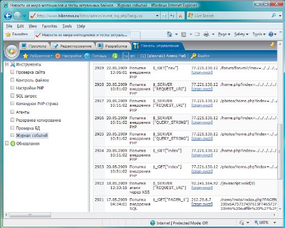 Журнал событий тест-сайта www.bikenews.ru