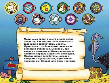 Среди них есть игры на реакцию, ловкость и внимательность, в частности электронные тир и теннис. Есть и такие, которые понравятся ребятам, любящим решать различные логические задачи. Например, ребенок может проверить свое пространственное воображение, решая мозаичные головоломки, перемещая по двумерным лабиринтам к заданному месту роботов или восстанавливая механизм из разновеликих шестеренок. Эрудитов, несомненно, заинтересуют викторины. Девочек привлекут выкройки и раскраски для платьев женской половины семейства Муми. Любители музыки сумеют проверить свой музыкальный слух, поиграть на несложных электронных музыкальных инструментах или развлечься за караоке, распевая песенки, популярные в местечке Муми-дол. Тем, кто любит рисовать, скорее всего понравятся наборы для творчества на компьютере. Помимо привычных карандашей, кисточек и красок, в них найдется немало заготовок, которые легко использовать для оформления писем, приглашений и поздравлений. Предусмотрена и возможность распечатки на принтере результатов своего художества.