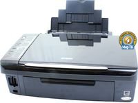 Устройство компании Epson, блистающее яркой внешностью, заметно выделяется на фоне многофункциональных аппаратов других производителей. Модель станет неоценимым подарком любителям наводить чистоту: ее полированные поверхности выглядят очень привлекательно, но им свойственно быстро загрязняться. Здесь применена четырехцветная система печати на основе пигментных чернил DURABrite Ultra, что способствует водостойкости отпечатков. Каких-либо дополнительных беспроводных или проводных интерфейсов у этого МФУ нет -- порт для прямой печати да привычный USB, разъем подключения которого удачно спрятан. Правда, немного удивляет расположение розетки питания -- производитель вынес ее практически в центр нижней части задней панели. На наш взгляд, это просто неудобно, ведь к стенке устройство не придвинуть, из-за чего место теряется впустую.