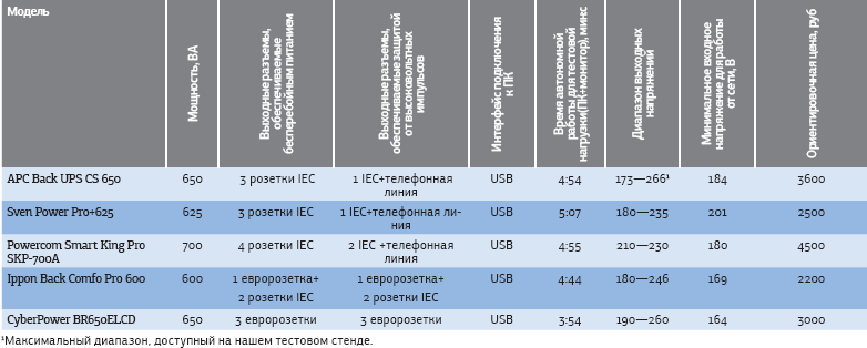 Все прочие требования и пожелания при выборе ИБП остаются прежними — достаточное время автономной работы, поддержание выходного напряжения в необходимых для устойчивой работы пределах, подходящий диапазон входного напряжения, при котором ИБП продолжает функционировать без переключения на батареи, удобство использования, подключения и замены аккумуляторов. Если не принимать во внимание экстремальные случаи вроде оснащения компьютеров четырьмя видеоплатами, то можно предположить, что в наши дни для защиты ПК и монитора от кратковременных сбоев в электрической сети будет достаточно решения мощностью 600—700 ВА. Мы проверили, как работают пять подобных ИБП, несколько различающихся и по цене, и по функциональным возможностям.