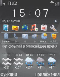 Программа, запускающаяся автоматически, по умолчанию предлагает дополнительную панель со значками Bluetooth-соединения, истории звонков и сообщений, контактов, режимов и событий. Чтобы переключиться в обычный режим, нужно лишь нажать красную кнопку. Если вы используете приложение Handy Weather версии не ниже 6.0, то получите в свое распоряжение симпатичный плагин с прогнозом погоды на пять дней (в стоимость Handy Shell входит годовая лицензия на погодный информер Handy Weather).