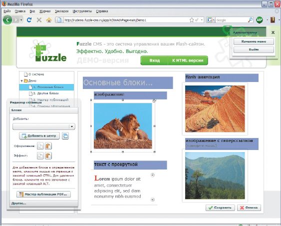 Возможность просто реализовать перетаскивание и прямая работа с объектами стали основой для российской разработки — Fuzzle CMS, системы управления Flash-сайтами. Основным принципом ее функционирования является True WYSIWYG: пользователь редактирует сайт, просто перемещая блоки, например, как на схемах в редакторе Visio. В результате сайт абсолютно одинаково выглядит как при редактировании, так и после сохранения. Блоки свободно перемещаются по всему рабочему полю сайта, что дает возможность не беспокоиться, как в HTML, о верстке. Разработчики сумели задействовать даже анимационные возможности Flash, в результате чего администратору дозволяется настраивать анимацию блоков при появлении страницы, комбинируя «появление», «движение» и несколько других эффектов.