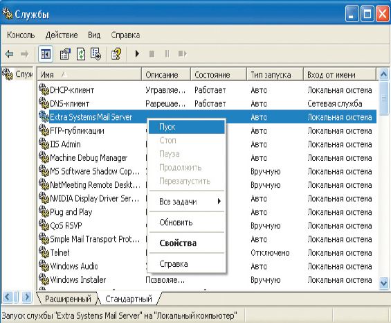 Файл ESMS.EXE обязательно запишите в системный каталог Windows. (Обычно он находится в корне диска C: и называется либо Windows, либо WINNT, но если возникнут сомнения, то определить его поможет команда echo %SystemRoot%, набранная в консоли.) Если же вы настраиваете сервер на основе операционной системы линейки NT, то программу лучше всего запускать в режиме службы, чтобы после перезагрузки компьютера она автоматически восстанавливала свою работу. Для этого наберите в консоли команду esms.exe /install, после чего зайдите в диспетчер служб, отыщите строку Extra Systems Mail Server и запустите службу (рис. 1).