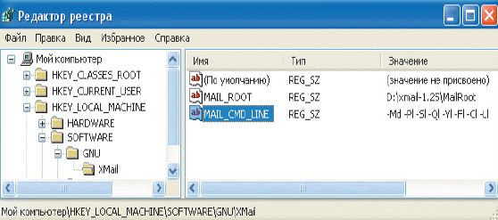 Запустите редактор реестра. Создайте ветку HKEY_LOCAL_MACHINESOFTWAREGNUXMail со строковыми параметрами MAIL_ROOT = "D:xmail-1.25MailRoot" и MAIL_CMD_LINE = "-Md -Pl -Sl -Ql -Yl -Fl -Cl -Ll" (рис. 2). Последний не является обязательным, но он обеспечит журналирование сообщений сервера в лог-файлах, что может оказаться весьма полезным при настройке программы.