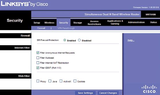 Ваш маршрутизатор почти наверняка оснащен встроенным сетевым экраном, содержащим две составляющие — трансляцию сетевых адресов NAT (Network Address Translation) и анализ содержимого пакетов SPI (Stateful Packet Inspection). В большинстве случаев режим трансляции сетевых адресов включен по умолчанию. Применение NAT-маршрутизации означает, что для всех подключений к Интернету используется один и тот же внешний IP-адрес, а все пришедшие на него пакеты данных перераспределяются роутером между компьютерами внутри локальной сети. Благодаря использованию технологии SPI появилась возможность убедиться в том, что входящие пакеты действительно поступают в ответ на запрос какого-либо из компьютеров, находящихся в сети. Рекомендуем активизировать опцию SPI в маршрутизаторе — как правило, необходимый для этого подпункт содержится в подразделе Security (Безопасность). При включенном режиме SPI он будет отклонять те пакеты данных, которые вы не запрашивали.