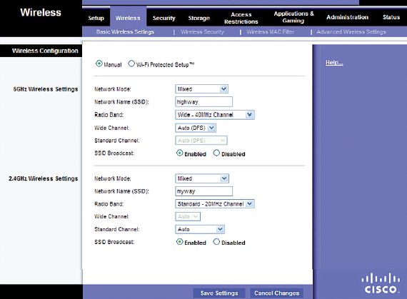 Хорошая идея — выбрать двухдиапазонный маршрутизатор. Такие устройства способны распределять трафик между частотными диапазонами 2,4 и 5 ГГц, что позволяет одновременно передавать больший объем данных с более высокой скоростью. Многие модели, например Linksys WRT610N или Netgear WNDR3700, могут разделить данные между двумя беспроводными сетями с разными идентификаторами SSID, благодаря чему несложно выделить медленные и не обеспечивающие необходимой безопасности данных устройства 802.11b в отдельную сеть.