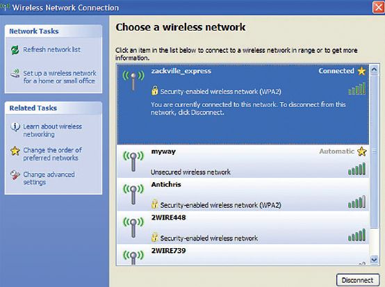 Войдите в Сontrol Panel (Панель управления), выберите раздел Network Connections (Сетевые подключения) и щелкните правой кнопкой на значке Wireless Network Connections (Беспроводные сетевые подключения). Потом откройте пункт меню Properties (Свойства), выберите вкладку Wireless Networks (Беспроводные сети) и нажмите кнопку Add (Добавить). Введите в текстовое поле идентификатор сети и отметьте опцию Connect even if this network is not broadcasting (Подключиться, даже если сеть не ведет вещание). Выберите стандарт WPA2 в пункте Network Authentication (Проверка подлинности) и режим AES в пункте Data Encryption (Шифрование данных) и дважды нажмите кнопку OK. Затем дважды щелкните мышью на значке Wireless Network Connections и выберите созданную вами беспроводную сеть. Нажмите кнопку Connect (Подключить), введите ключ шифрования и снова нажмите ту же кнопку. Теперь компьютер запомнит пароль доступа к сети и в дальнейшем будет подключаться к ней автоматически.