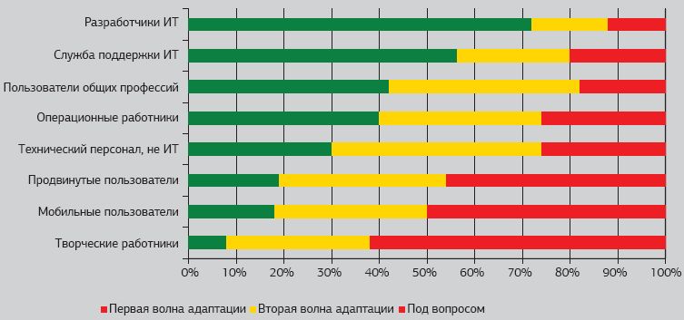 Система Windows горизонтальна по своей природе вне зависимости от того, кто ее использует. Однако при переходе на Linux совсем не обязательно придерживаться такого же построения. Требования каждого из пользователей весьма различны, к примеру, одним необходимы электронная почта, текстовый редактор и браузер, другим — специализированные системы. Поэтому в ходе опроса респондентам было предложено разбить пользователей на несколько целевых аудиторий, чтобы выяснить, каким из выделенных групп стоит заниматься первоначальной адаптацией, каким — обработкой опыта внедрения, а каким, возможно, и вовсе не стоит переходить на использование Linux. С категорией опытных ИТ-специалистов сюрприза не произошло: это очень хороший выбор для первопроходцев — продвинутых пользователей.