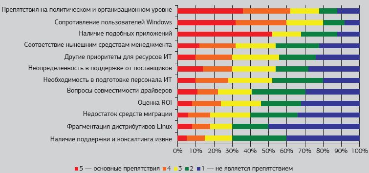 Среди 12 потенциальных препятствий на пути распространения Linux высокий рейтинг получили не технологические проблемы, а инерция всех тех, кто пока еще предпочитает Windows. На первом месте оказались препятствия, возникающие на политическом и организационном уровнях, на втором — сопротивление пользователей. На протяжении многих лет они работали с помощью Windows. И хотя эта ОС была не идеальна, привыкать к новому многим не хочется. На четвертом месте в рейтинге оказался вопрос о том, насколько соответствуют задачи, поставленные бизнесом, программному обеспечению, основанному на Windows. Как следует из графика, остальные перечисленные препоны не являются существенными. Так, поддержка драйверов попала лишь на восьмое место в списке, а фрагментация дистрибутивов — и вовсе на одиннадцатое.