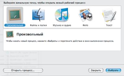 Итак, давайте приступим к созданию первого сценария. Правда, следует заметить, что данное приложение поставляется с Mac OS X версии не ниже 10.4, а значит, в более старом дистрибутиве его еще нет. Сейчас мы воспользуемся Automator 2.0.2, функционирующим под управлением Mac OS X Leopard. Это приложение находится в папке «Программы». После его запуска появится всплывающее окно, где предлагаются шаблоны для сценариев. Выберите пустой шаблон (т. е. его отсутствие), щелкнув на значке с надписью «Произвольный». Перед вами откроется главное окно программы. В его левой части находится список различных действий с их описанием внизу, а в правой — указанный сценарий (действия приведены в порядке выполнения).