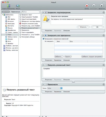 Теперь создайте короткое голосовое сообщение, которое будет уведомлять о том, что все программы закрыты. Для этого перейдите в категорию «Текст» и добавьте в сценарий действие «Получить указанный текст». В поле ввода наберите «Complete». Нужно ввести слово на английском языке, поскольку русский система не понимает — он сейчас не поддерживается Mac OS X (вернее, подсистемой VoiceOver Mac OS X) да и вряд ли будет в ближайшем будущем. Снова вернитесь в категорию «Служебные программы» и добавьте в сценарий действие «Произнести». Здесь предлагается выбрать голос для озвучивания.