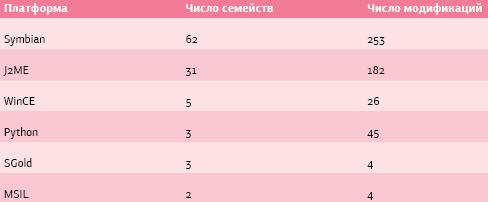 По данным «Лаборатории Касперского» (http://www.securelist.com/ru/analysis/208050548/Mobilnaya_virusologiya_chast_3), число семейств и модификаций вредоносного ПО для мобильных телефонов сейчас распределяется по платформам следующим образом.