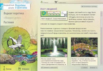Возможно, поэтому диск и пытается «выпендриться»: вместо «Планировки» — «Мокрое дело»; вместо одноименных с диском разделов («Стили», «Цветники») — «Водная теоретика». Но это внешне, изнутри же он почти ничем не отличается от предшественников. «Теоретика» содержит общие сведения, «Мокрое дело» — практические решения. (Правда, вот какая странная закономерность: во втором «томе» каждое из них занимало по три статьи, в третьем — по две, а в четвертом… Правильно, одну.)