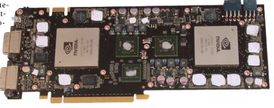 По габаритам это устройство не отличается от предыдущей версии, также занимает два слота расширения. Вероятно, для того, чтобы разместить два графических адаптера и все необходимые микросхемы памяти на одной печатной плате, инженерам nVidia пришлось использовать плату с большим числом проводящих слоев. Наряду с двумя ГП и 28 микросхемами памяти типа GDDR3 производства Hynix на плате распаяны три интерфейсных контроллера.