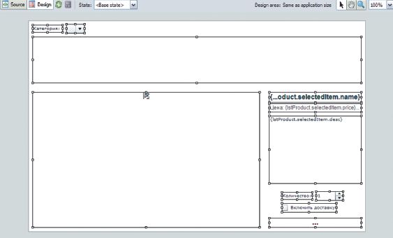 источник данных для адреса ваших картинок: source=?©img/{lstProduct.selectedItem.img}.big.jpg?© (Flex поддерживает и такие сложные конструкции для связывания данных); • источники данных для всех текстовых элементов, например для цены (text=?©Цена: {lstProduct.selectedItem.price} р.?©).