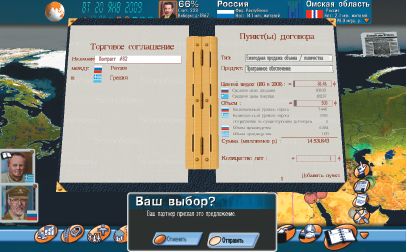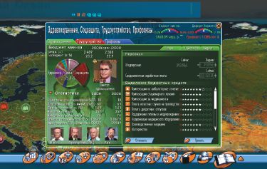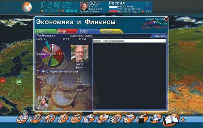 Внизу рабочего экрана размещена линейка меню со всплывающими окнами для оперативного управления страной. Эти окна открывают доступ к информации, отражающей состояние дел в самых важных министерствах страны, к управлению их бюджетами, к механизму влияния на законодательную базу страны и к президентскому еженедельнику, позволяющему планировать деловые контакты.