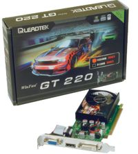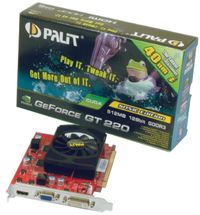 К нам поступили две реализации видеоадаптера nVidia GeForce GT220: Leadtek WinFast GT220 1024MB DDR3 и Palit GeForce GT 220 Sonic. Устройство компании Leadtek по частотам полностью аналогично эталонному дизайну корпорации nVidia, правда, сама плата более компактная, к ней прилагается узкая скоба, прикрепляемая к задней панели, что требуется для установки платы в небольшие корпуса HTPC. Видеокарта фирмы Palit внешне похожа скорее на эталонную плату — она широкая и не годится для низкопрофильных корпусов.