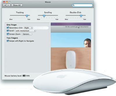 Абсолютно гладкая поверхность мыши интерпретирует нажатия как «клики» на правую и левую кнопки и прокрутку. (Кстати, что-то похожее уже встречалось в предыдущей модели — Apple Mighty Mouse.) Вся поверхность здесь — одна физическая кнопка, за остальное отвечают сенсоры. Нажатие, произведенное справа или слева от осевой линии, отрабатывается как нажатие соответствующей кнопки.