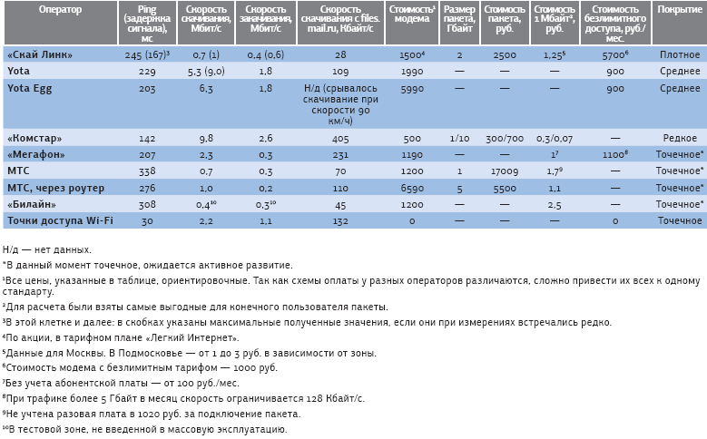 Покрытие у сетей неравномерное, и, даже оставаясь на одном месте, пользователь не получит постоянной скорости из-за колебаний загрузки базовых станций. Поэтому в таблице указаны только характерные значения, встречавшиеся чаще всего, а в скобках приведены максимальные значения.