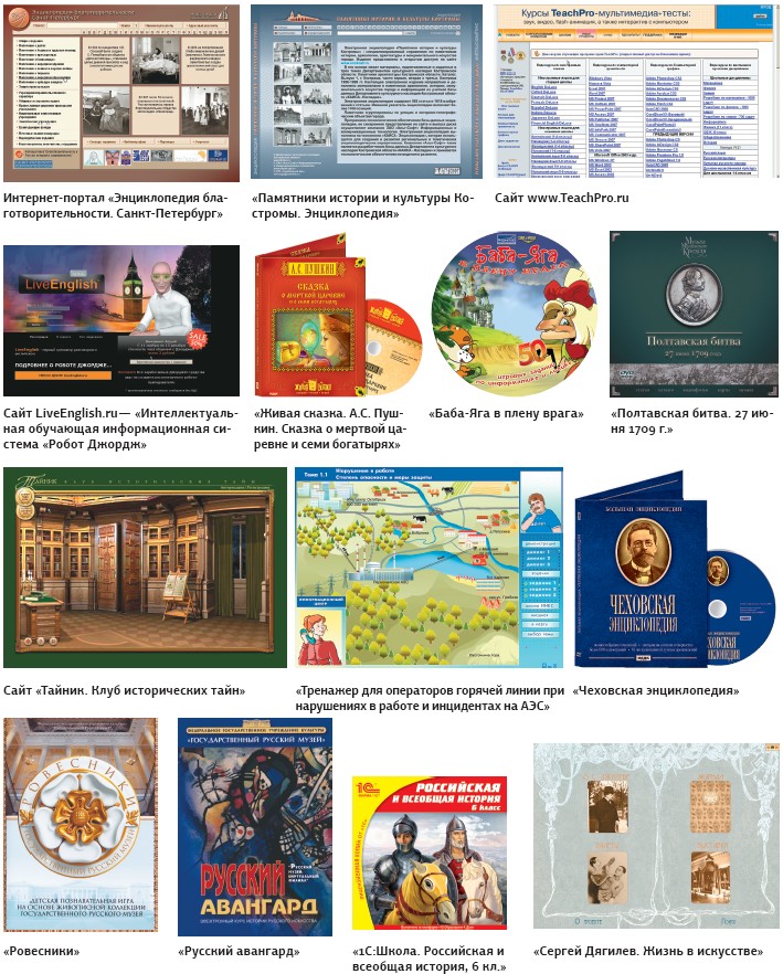 Интернет-портал «Энциклопедия благотворительности. Санкт-Петербург» — http://encblago.lfond.spb.ru (Международный благотворительный фонд имени Д. С. Лихачева/«Альт-Софт»); «Памятники истории и культуры Костромы. Энциклопедия» (Департамент культурного наследия Костромской области/«Альт-Софт»); сайт www.TeachPro.ru (е-Издательство «Мультимедиа Технологии»); сайт LiveEnglish.ru — «Интеллектуальная обучающая информационная система «Робот Джордж» (Санкт-Петербургский университет культуры и искусств); «Живая сказка. А. С. Пушкин. Сказка о мертвой царевне и семи богатырях» («Издательство» (торговая марка «ИДДК»); сайт «Тайник. Клуб исторических тайн» — www.taynic.ru («МПСС»/«Клен»).