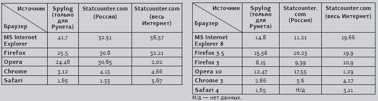 Статистика по семействам браузеров и по последним стабильным версиям (ноябрь, 2009)