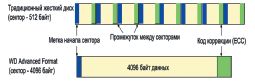 Компания Western Digital приступила к производству жестких дисков с размером сектора 4096 байт. (Видимо, он был выбран по аналогии с этим же параметром у твердотельных дисков.) Нововведение получило название WD Advanced Format. Переход на новый сектор позволяет более эффективно использовать место на пластине (увеличивается плотность записи информации), что не только увеличивает объем накопителя примерно на 10%, но и дает соответствующий прирост в линейной скорости. На случай несовместимости какого-либо ПО или контроллера с увеличенным сектором жесткие диски WD имеют режим эмуляции 512-байтового сектора. Для правильного форматирования накопителя в режиме эмуляции следует использовать специальную утилиту WD Align, доступную на сайте WD. Это актуально для всех пользователей Windows XP, а также для владельцев Windows Vista и Windows 7, планирующих клонировать раздел со старого диска.