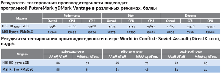 Для наглядности в таблицах мы также привели результаты тестирования видеоплаты AMD Radeon HD 5870 компании MSI. Тестирование показало, что не во всех играх наблюдался прирост производительности. В нашем случае количество кадров в секунду, вероятнее всего, ограничивается производительностью процессора. Кроме того, не стоит забывать о существовании игр, неспособных использовать несколько ГП. Самые высокие результаты Radeon HD 5970 показал в игре FarCry 2 и синтетических тестах — очевидно, современные игры еще не рассчитаны на такое быстрое «железо». В настоящее время приобретение данной видеокарты может быть оправдано желанием использовать технологию ATI Eyefinity — разрешение трех мониторов позволит в полной мере раскрыть потенциал Hemlock.