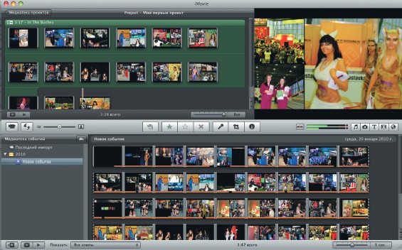 Менеджер фотоколлекций iPhoto из состава пакета мы уже подробно рассматривали (см. «Мир ПК», №4/09, с. 56). На сей раз обсудим самый популярный компонент — iMovie. Рассчитанная на пользователей любого уровня подготовки, эта программа удовлетворяет львиную долю домашних видеопотребностей. Независимо от того, работаете ли вы с данными на каком-либо DV-устройстве или с разношерстными по формату и качеству файлами, iMovie позволяет за минимальное время получить приемлемый результат для дальнейшего размещения на DVD, YouTube либо просто для экспорта в файл. Причем пользователь действует в достаточно жестко ограниченных рамках, чтобы предотвратить рождение очередного урода. И это одно из главных достоинств программы — весьма проблематично окончательно искалечить видео, даже если очень постараться.