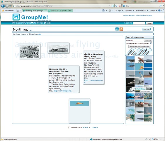 Работа с аккаунтом GroupMe достаточно проста. Пользователю предлагается не только проставлять теги на сохраняемые ресурсы, но и объединять их в тематические группы с помощью удобных рабочих пространств. Наполнение группы контентом осуществляется несколькими способами: стандартным указанием URL нужных ресурсов, посредством поиска в Google и Flickr, а также путем поиска по базе GroupMe. Поддерживается хранение текстов, изображений, аудио- и видеофайлов. Добавить к своей группе ресурсы можно просто перетаскиванием найденных ссылок на рабочее пространство открытой группы. Элементы группы свободно располагаются на рабочем пространстве. Каждый объект имеет собственное контекстное меню. Конечно, такое решение делает работу с объектами максимально наглядной, однако оно усложняет сортировку в группах с большим количеством элементов.