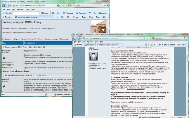 Отдельной статьей идут DDoS-атаки (Distributed Denial of Service attack), когда в один момент с тысячи компьютеров-ботов к определенному серверу-жертве отправляются бесчисленные запросы. Такая сетевая активность положит на лопатки многие бизнес-сайты, а стоят подобные услуги всего от 100 долл. – выбирайте конкурентов и потирайте руки.