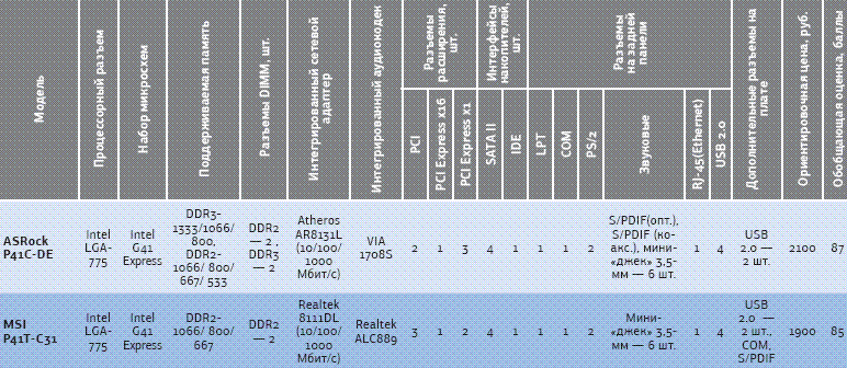 А раз есть процессоры, то есть и системные платы для них. Вероятно, спрос на эти комплектующие будет сохраняться до тех пор, пока Intel окончательно не снимет с производства процессоры с разъемом LGA-775 и наборы микросхем под них. Кстати, среди системных плат на базе этой платформы даже появляются новинки. Одна из них — устройство P41C-DE компании ASRock. Эта системная плата основана на чипсете Intel G41 Express, однако интегрированный в северный мост графический адаптер не задействован. Чтобы наиболее объективно оценить достоинства и недостатки данного устройства, мы сравнили его с близкой по функциональности и цене системной платой MSI P41T-C31.