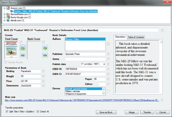 Программа Alfa Ebooks Manager обладает хорошими средствами автоматизации создания каталога. Получив ISBN, заглавие или другой поисковый признак, она ведет поиск на сайтах крупнейших книжных интернет-ресурсов, посещая не только зарубежные Amazon и Barners&Noble, но и российские Books.ru и Ozon.ru, что значительно повышает шансы автоматически получить описание книг на русском языке. По завершении поиска пользователю предлагается таблица результатов, чтобы он мог выбрать нужную книгу. Затем программа открывает окно слияния сведений, где выводятся все данные, полученные из онлайнового источника. Если они не совпадают с введенными вручную, то соответствующие позиции выделяются красным цветом шрифта. Дополнить свою запись можно как отдельными значениями, для чего понадобится отметить их в этом диалоговом окне, так и полным переносом всех сведений в свою запись. Нужно заметить, что Alfa Ebooks Manager умеет не только получать текстовую информацию (сведения о книге и издательская аннотация), но и скачивать графические миниатюры обложек. Затем их можно присоединить к своей записи, чтобы более наглядно отобразился список книг персональной цифровой библиотеки.