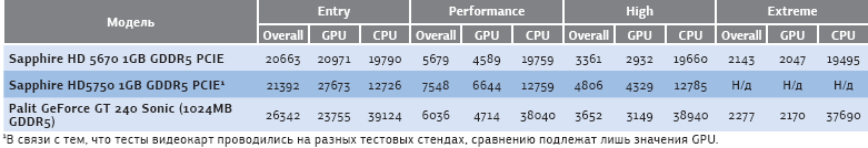 Результаты тестирования производительности программой FutureMark 3DMark Vantage, баллы