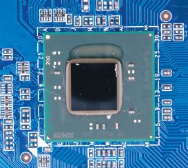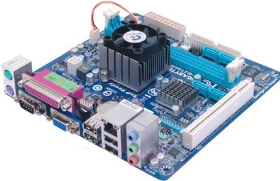 Хотя количество выводов ЦП теперь составляет 559, а не 479, как у устройства Atom предыдущего поколения, микросхема занимает совсем немного места — ее габариты 22×22 мм. Поэтому даже на плате формфактора Mini-ITX процессор и чипсет располагаются довольно просторно. Процессор охлаждается активным кулером, регулировка скорости вращения лопастей 40-мм вентилятора осуществляется автоматически. Помимо них, на плате распаяны контроллер Gigabyte SATA 2, обеспечивающий два порта SATA в дополнение к двум штатным, а также микросхема iTE IT8720, являющаяся контроллером интерфейса IDE. На задней панели находятся четыре гнезда USB, два разъема SATA, три 3,5-мм аудиоразъема.