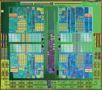 Нынешний флагман компании — процессор Phenom II имеет двух-, трех- и четырехъядерные модификации. Эти продукты мы не случайно называем модификациями одного процессора. Дело в том, что они базируются на одном и том же кристалле, на основе которого в зависимости от качества его конкретного экземпляра производятся четыре серии процессоров Phenom II. Процессоры «топовой» серии 900 имеют по четыре ядра, по 512Кбайт кэш-памяти второго уровня на ядро, а также по 6-Мбайт кэшу третьего уровня. Тактовые частоты таких процессоров варьируют от 2,8 до 3,4 ГГц. Из кристаллов с поврежденной кэш-памятью третьего уровня производятся процессоры серии 800. Они отличаются от серии 900 только меньшим объемом кэш-памяти (4 Мбайт вместо 6) и меньшими тактовыми частотами, составляющими 2,5 — 2,6 ГГц. Четырехъядерные ЦП Phenom II серий 800 и 900 носят общее кодовое имя Deneb.