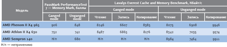 Процессоры AMD имеют два режима работы контроллера памяти — Ganged mode (спаренный) и Unganged mode (неспаренный). При использовании спаренного режима все четыре (или два) ядра имеют доступ к ОЗУ через единую шину. В неспаренном же режиме если процессор четырехъядерный, то два его ядра имеют доступ к одной половине объема ОЗУ, а еще два — к другой. Следовательно, если ЦП двухъядерный, то ОЗУ делится поровну между ядрами. Фактически в этих процессорах находятся два 64-разрядных контроллера памяти, которые могут работать либо синхронно, как один 128-разрядный двухканальный контроллер памяти, либо независимо. В последнем случае достигается более высокая эффективность в многопоточных приложениях. При проведении тестов производительности мы использовали режим Ganged mode.