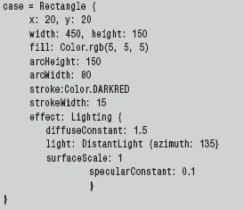 Теперь корпус готов. Осталось добавить немного спецэффектов с помощью параметра effects. Мы применим эффект освещения Lighting, чтобы объект стал реалистичнее. Уточним кое-какие его особенности: diffuseConstant обеспечивает рассеивание света, specularConstant придает объекту блеск, создавая эффект зеркала, surfaceScale делает объект по-настоящему трехмерным, реализуя эффект затемнения его краев. Наконец, параметр корпуса light позволяет указать, какого типа свет направлен на объект. В рассматриваемом примере используется равномерное освещение, источник которого находится сверху слева.