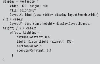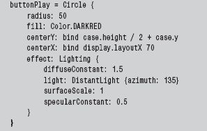 Перейдем к описанию экрана плеера, задаваемого в листинге 2 объектом display. Переменные, описывающие прямоугольник, вам уже знакомы. Уточним два новых параметра: layoutX и layoutY. Эти переменные — методы позиционирования узла на сцене. С их помощью мы разместим экран в центре корпуса плеера.