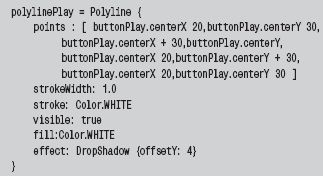 Класс Polyline позволяет рисовать любые фигуры из прямых линий, задавая координаты через запятую (x и y). Делается это внутри квадратных скобок переменной points. Параметр Visible сообщает о том, что фигура будет показана на экране (это необходимо для того, чтобы менять ее на два прямоугольника, символизирующих паузу), а эффект DropShadow показывает тень у фигуры и добавляет немного живости в картинку.