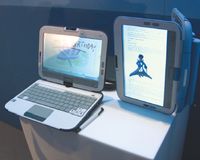 Растет и список устройств на электронных чернилах. Так, ASUS представила э-книжку DR-900 E-Reader, имеющую 9-дюймовый экран с разрешением 1024×768 точек и встроенную память объемом 2 или 4 Гбайт (на фото на стр. 73 слева). Кроме того, модель будет снабжена модулями беспроводной связи Wi-Fi или 3G для скачивания материалов непосредственно из Интернета. Компания MSI тоже показала любопытный продукт — ее электронная книга раскрывается, как обычная, и пользователь может читать текст на обеих страницах, как и в бумажной интерпретации.