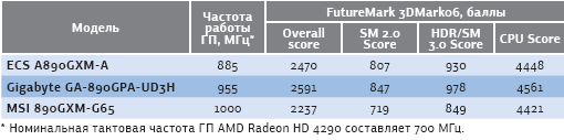 Для тестирования системных плат были использованы процессор AMD Phenom II X4 955, охлаждаемый кулером GlacialTech Igloo 7321 PWM, комплект памяти типа DDR3 — Patriot PVS34G1333LLK, жесткий диск Western Digital VelociRaptor WD3000GLFS емкостью 300 Гбайт, блок питания Enermax Revolution 85+ мощностью 850 Вт. Тайминги памяти во всех случаях устанавливались в значение Auto. Все три протестированные платы снабжены 128-Мбайт памятью Performance cache, однако мы дополнительно выделили для нужд графического адаптера 128 Мбайт из объема основного ОЗУ. Формальная часть испытаний заключалась в запуске синтетических тестов Passmark PerformanceTest 7 и FutureMark 3DMark06. Кроме того, была измерена производительность интегрированного графического процессора в игре Left4Dead. В большинстве случаев при тестировании системных плат на одном наборе микросхем программные тесты производительности показывают близкие результаты, различающиеся порой на величины, соизмеримые с погрешностью измерений. Поэтому нами было решено разнообразить нашу методику, добавив в нее тест на разгон интегрированного графического ядра. Питающее напряжение северного моста мы поднимать не стали, а лишь изменяли рабочую частоту ГП. Стабильность системы проверялась с помощью стресс-теста FurMark 1.8.0. Прирост производительности мы оценивали по результатам 3DMark06. Когда ставились оценки, то учитывались функциональность системной платы, качество исполнения, оправданность цены.