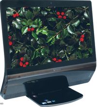 Внешне моноблок выглядит довольно нарядно благодаря глянцевой лицевой поверхности корпуса. Экран настолько хорошо отражает свет, что в выключенном состоянии он вполне справится с ролью зеркала. Хотя моноблок достаточно тяжелый, он держится на своей подставке вполне надежно и устойчиво. Углы наклона дисплея можно изменять от 15° назад до 5° вперед. Над дисплеем расположена 2-Мпикс веб-камера с фиксированным фокусом и двумя микрофонами, что обеспечивает выгодную диаграмму направленности.
