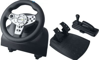 Как и манипулятор компании Defender, это устройство можно отнести к бюджетным. При невысокой цене оно обеспечивает вполне приемлемые ощущения. Комплект поставки стандартный: рулевая колонка, педальный блок и коробка передач, совмещенная с ручным тормозом. Рулевое колесо сделано небольшим, под стать спортивным. Углы поворота вполне приемлемые — 270°.