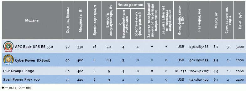 На этот раз раздать награды оказалось довольно сложно. Например, хотя модель APC Back-UPS ES 550 и продемонстрировала наименьшее время функционирования среди рассматриваемых образцов, она все же имеет наибольшее число розеток и не нагревается при работе. К тому же у нее весьма качественный корпус. Поэтому мы присудили ИБП компании АРС значок «Выбор редакции».