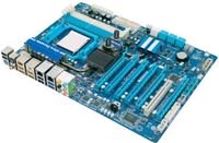 В качестве системной платы на интересующем нас наборе микросхем AMD 890FX была выбрана Gigabyte GA-890FXA-UD7 — функциональное устройство, ориентированное на применение в производительных ПК, а также предназначенное для разгона. Из всех системных плат компании Gigabyte под процессоры AMD данная модель — самая дорогая. О ее принадлежности к экстриму свидетельствует наличие в комплектации радиатора Hybrid Silent-Pipe 2 и водоблока на северном мосту. Это весьма актуально, поскольку установка системы жидкостного охлаждения (СЖО) в ПК с несколькими видеокартами весьма разумна, а штатный водоблок позволит сэкономить деньги на его покупке и упростит монтаж СЖО. Кроме того, охладитель северного моста посредством тепловых трубок соединен с южным мостом и радиатором, размещенным на полевых транзисторах, питающих процессор, и потому при использовании СЖО эффективно охлаждаться будут все компоненты системной платы, что весьма важно при разгоне процессора.