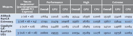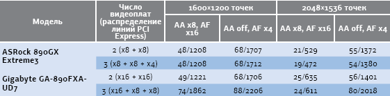 Наши наблюдения показали, что чипсет AMD 890FX обеспечивает существенный прирост производительности массива CrossFireX по сравнению с AMD 890GX, а если видеокарт в массиве будет более двух, то применять его нужно обязательно.