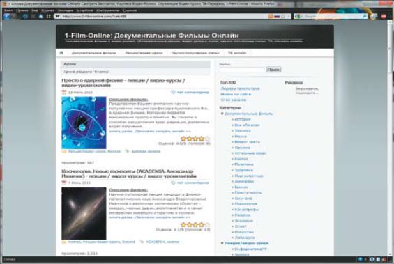 Если проект UniverTV ориентируется на пользователей с образовательными потребностями, то видеосервис «Документальные фильмы онлайн» носит в основном познавательный и развлекательный характер, что, впрочем, не умаляет его достоинств. Основа коллекции 1‑Film-Online — научно-популярные фильмы и видеолекции, причем направление в сторону «популярности» контента видно невооруженным глазом. Однако не стоит считать это недостатком — у проекта просто своя ниша. Доступно и увлекательно рассказать о современной науке — достаточно сложная задача.