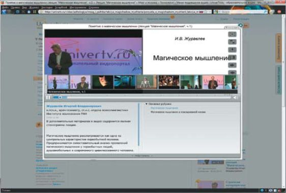 Просмотр видеоматериалов на сайте обеспечивает собственный онлайновый плеер, обладающий интересными функциями. Его экран разделяется на несколько зон, и основная отводится самому видеоролику, который позволительно развернуть на весь экран. Плеер также содержит панели с дополнительным материалом к видеолекции, например со своеобразной презентацией, состоящей из слайдов, иллюстрирующих ключевые тезисы. А еще в качестве дополнения может выступать текстовый конспект лекции, который либо предлагается к просмотру во время проигрывания видео, либо к скачиванию в виде файла DOC-формата. К сожалению, конспекты пока являются экспериментальной функцией, и потому они доступны лишь для нескольких тестовых лекций. Остается только пожелать, чтобы это начинание поскорее распространилось на основную часть контента.