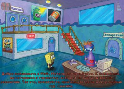 Вообще, мышь — единственное и незаменимое устройство, необходимое для управления всеми действиями главного героя, т. е. Губки Боба. «Живой» курсор мыши, изменяя свой вид, подсказывает, какие из близлежащих объектов достойны внимания геймера: одни из них ему следует осмотреть, другие — прихватить в свой походный сундучок, к третьим, как говорят геймеры, применить что-то из ранее найденного и припасенного в сундучке, а с кем-то понадобится просто пообщаться… И все это подсказывает наш покорный слуга — курсор.